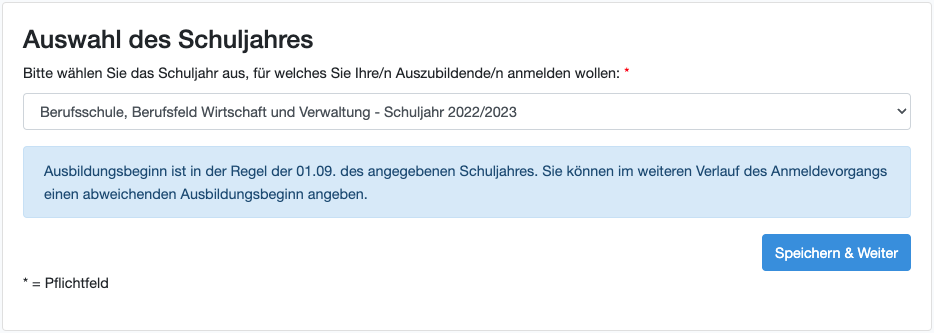 - Beginn der Ausbildung (falls Sie eine/n Auszubildende/n unterjährig zur Berufsschule anmelden wollen, wählen Sie den Beginn der vorherigen Periode aus)
