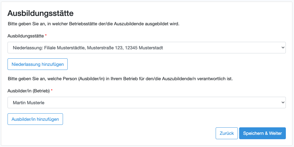 Falls die Auszubildenden eine abweichende Ausbildungsstätte haben (z. B. eine Niederlassung), dann können Sie diese hier auswählen. Außerdem legen Sie hier den/die Ausbilder/in des/der Auszubildenden fest.