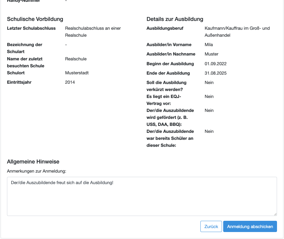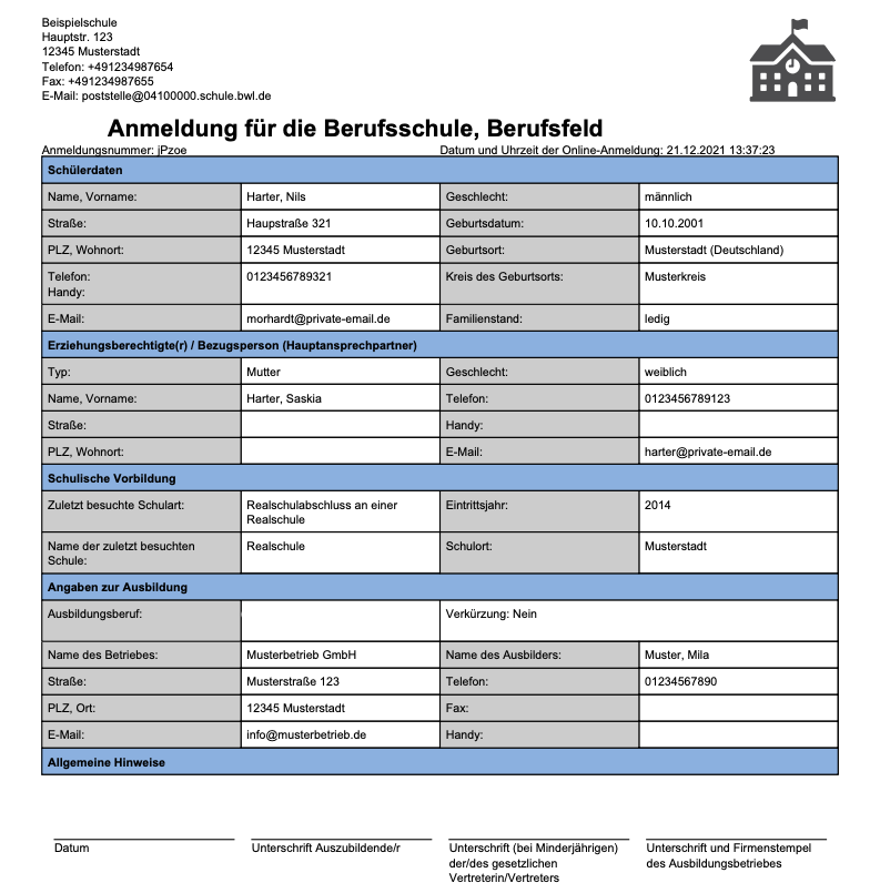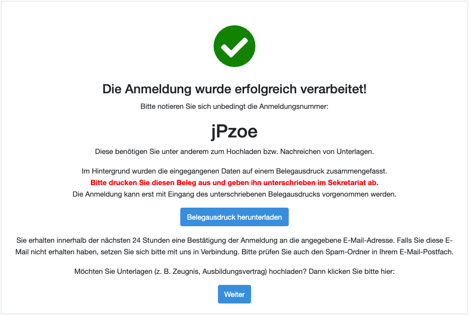 Auf dem Belegausdruck sind die wesentlichen Informationen nochmals zusammengefasst. Um die Anmeldung abzuschließen, muss der Belegausdruck vom Auszubildenden, bei Minderjährigen vom gesetzlichen Vertreter und vom Betrieb (mit Firmenstempel) unterschrieben und bei der Schule im Original vorgelegt werden.