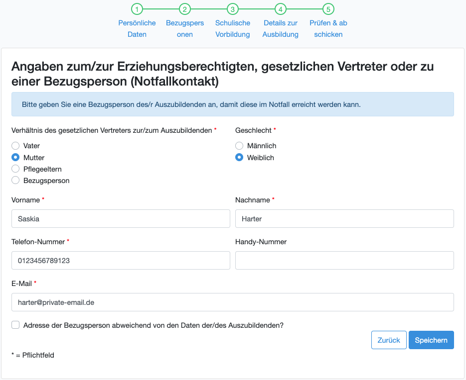 - Falls Adresse der Bezugsperson abweichend von den Daten der/des Auszubildende/n:
