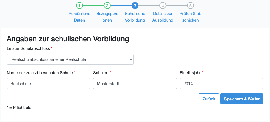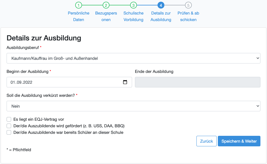 Das Feld "Ende der Ausbildung" wird vom System ausgefüllt. Beachten Sie, dass die schulische Ausbildung in der Regel immer am 01.09. des Jahres beginnt.