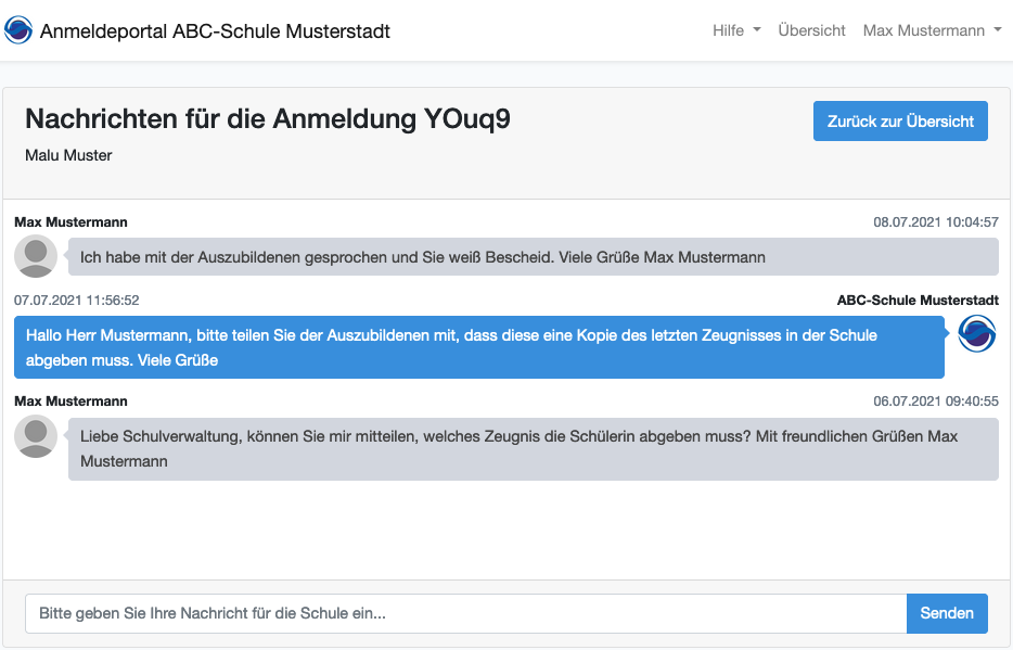 Mit einem Klick auf den Briefumschlag hinter der Anmeldung können Sie die Nachrichten sehen, welche im Zusammenhang mit der Anmeldung erfasst wurden oder der Schule eine Nachricht schreiben. Da der Nachrichteninhalt nicht per E-Mail übermittelt wird, können Sie auf diesem Weg sensible Informationen DSGVO-konform mit der Schule austauschen.