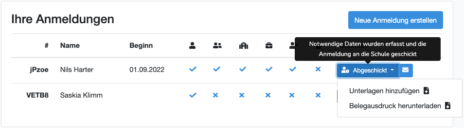 Sobald die Anmeldung abgeschickt wurde, können Sie diese nicht mehr bearbeiten, sondern nur noch Unterlagen hinzufügen oder den Belegausdruck herunterladen: