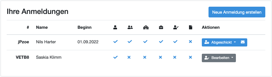 In der Übersicht finden Sie die Anmeldungsnummer, den Namen und den Beginn der Ausbildung, sowie den Fortschritt der Anmeldung. Wird ein blauer Haken angezeigt, sind alle Daten für den jeweiligen Schritt vorhanden, bei einem Kreuz müssen noch Daten ergänzt werden. Sie gelangen direkt zur jeweiligen Maske, indem Sie auf den Haken bzw. das Kreuz klicken. Weitere Aktionen (z. B. „Anmeldung löschen“) finden Sie unter der Schaltfläche bei Aktionen.