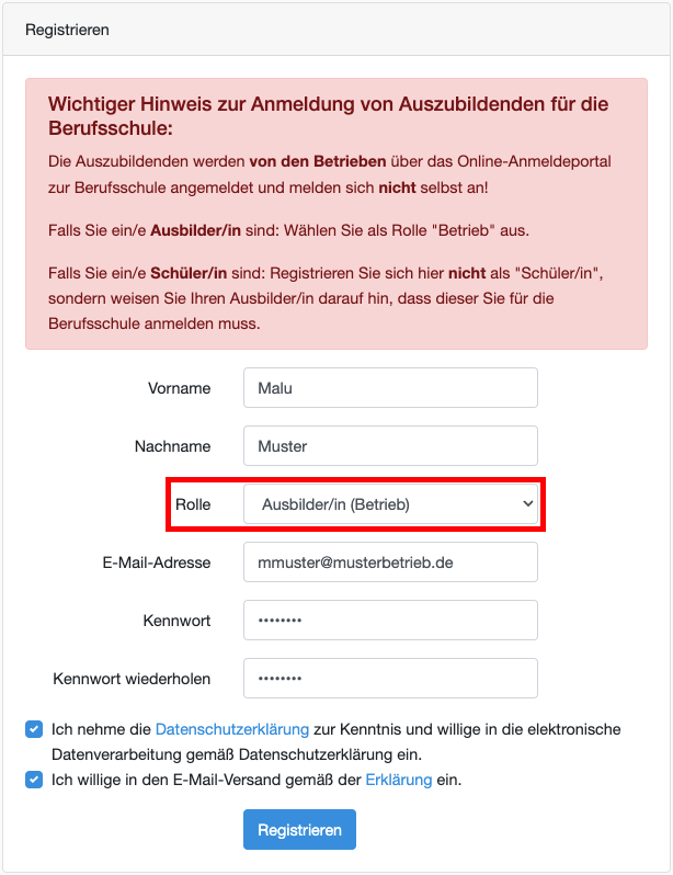 Geben Sie im nächsten Schritt Ihre persönlichen Daten an, sowie als Rolle „Ausbilder/in (Betrieb)“. Lesen Sie sich die Datenschutzerklärung, sowie die Erklärung über den E-Mail-Versand durch und akzeptieren Sie diese. Wichtig: Verwenden Sie die E-Mail-Adresse Ihres Betriebs (keine private Adresse).