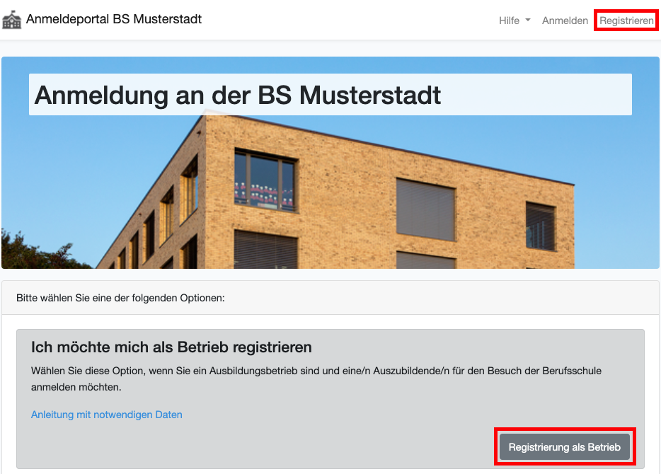 Im Portal können Sie Ihre Auszubildenden für die Berufsschule anmelden. Hierbei können Sie komfortabel alle Anmeldungen für Ihren Betrieb verwalten, unterbrochene Anmeldungen fortsetzen und Unterlagen hochladen. Zunächst müssen Sie sich einmalig mit Ihrer E-Mail-Adresse registrieren. Wählen Sie hierzu die Schaltfläche "Registrierung als Betrieb" aus oder klicken Sie rechts oben auf "Registrieren".