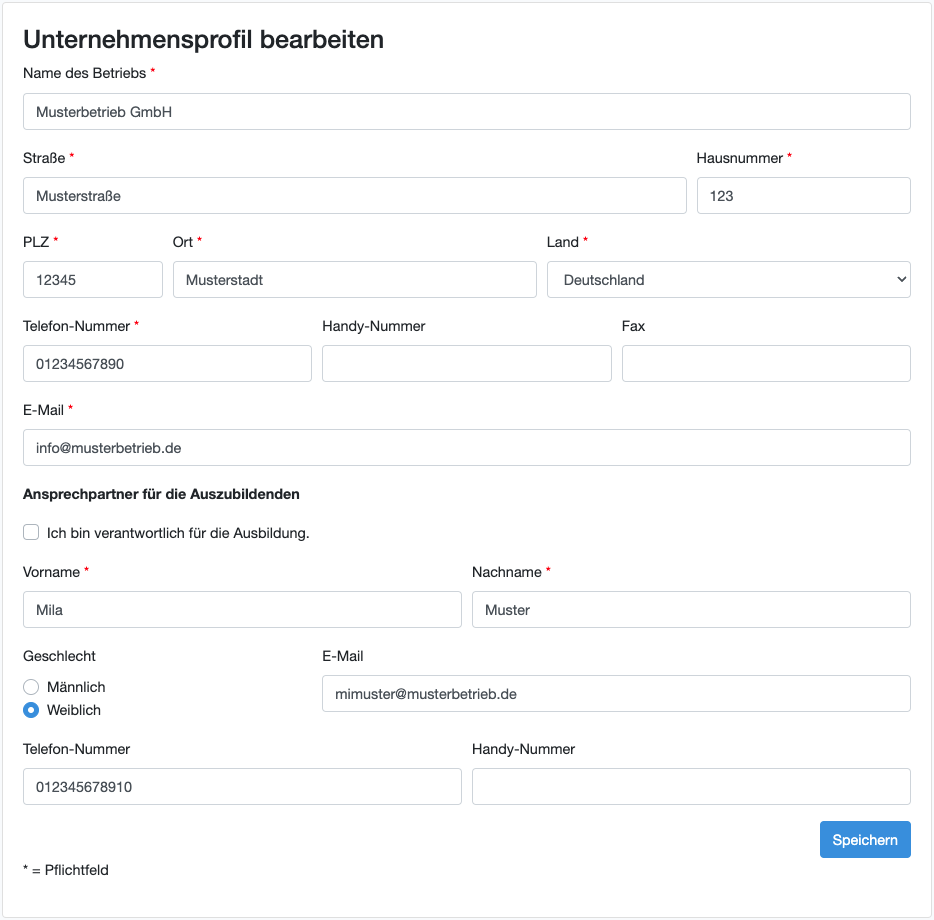 Falls Sie selbst verantwortlich für die Auszubildenden in Ihrem Unternehmen sind, klicken Sie auf „Ich bin verantwortlich für die Ausbildung.“. Der/die Verantwortliche wird bei uns als Ansprechpartner für Rückfragen etc. eingetragen. Sie können das Profil jederzeit bearbeiten, indem Sie rechts oben auf Ihren Namen klicken und dann auf „Unternehmensprofil bearbeiten“. Falls weitere Mitarbeiter die Anmeldungen verwalten sollen, können diese Ihrem Unternehmensprofil zugeordnet werden. Sie können diese über den Menüpunkt "Benutzerverwaltung" einladen.